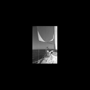 35 mm black-and-white negative; photographed by Carleton Mitchell; deck view of yawl yacht FINISTERRE; ca. 1957; possibly during a race; handwritten on original envelope "R 27671 C37" (corresponds to original Mitchell contact sheet); printed on negative frame number "15".