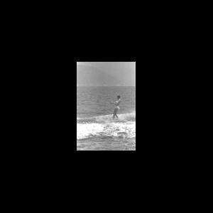 35 mm black-and-white negative; photographed by Carleton Mitchell; Helen Hindmarsh waterskiing; Portofino, Italy; 1960; handwritten on original envelope "R 28926 C4" (corresponds to original Mitchell contact sheet); printed on negative frame number "22".