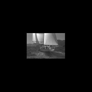 35 mm black-and-white negative; photographed by Carleton Mitchell; sloop yacht KIALOA under sail during yacht race; ca. 1960; handwritten on original envelope "R 34076 2-C S-60" (corresponds to original Mitchell contact sheet); printed on negative frame number "23".