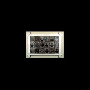 Eighteen tintypes in a white whalebone frame, c. 1864. Belonged to Captain Frederick Howland Smith of South Dartmouth, MA. Captain Smith's picture is in center showing him in his Civil war uniform. His wife, Sally, is pictured at top right hand of frame. Captain Smith reportedly kept this frame of pictures in his cabin on the bark OHIO. Frederick Howland Smith (1840-1924) went to sea as cabin boy of a whaleship at age 14. After rising through the ranks and serving in the army during the Civil War he commanded his first ship at age 29. He went on to become captain of the bark OHIO, and his wife joined him at sea after his first voyage. Sallie kept a journal of their voyages as Frederick spent his days working and making scrimshaw. The bark OHIO was built in Rochester, Massachusetts in 1833. She was lost in the Arctic Ocean in 1889.