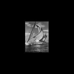 4x5 safety negative photographed by Rosenfeld and Sons in 1939. Image of 69' Burgess & Morgan designed, Abeking & Rasmussen built 12 meter class cutter ZIO and sloop NIGHTWIND (built 1928 in Lemwerder, Germany) cruising on Long Island Sound at 1939 New York Yacht Club Cruise. Visible in image: cropped starboard beam view of NIGHTWIND (12/1) and ZIO to her port side running before the wind under marconi-rigged mainsails and spinnakers creating large bow waves. CREDIT LINE: Mystic Seaport, Rosenfeld Collection. For more information see: A CENTURY UNDER SAIL, text by Stanley Rosenfeld, p. 134. Handwritten on negative sleeve: “93592F / Zio and NightWind / NYYC Cruise 1939”.