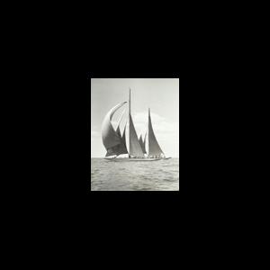 5x7 safety negative photographed by Rosenfeld and Sons in June of 1934 off Newport, Rhode Island. Image of J class sloops RAINBOW and WEETAMOE racing showing a port beam view of both boats with spinnakers set and crews at work on deck. RAINBOW was a 126'7" J boat design by Burgess & Donaldson, Inc. and built by Herreshoff Manufacturing Company of Bristol, Rhode Island in 1934. WEETAMOE was a 125'9" J Class sloop built by Herreshoff Manufacturing of Bristol, Rhode Island from designs by Sparkman & Stephens in 1930. Stamped negative sleeve: "68275F / [Box] 4304". Handwritten: "Rainbow & Weetamoe". CREDIT LINE: Mystic Seaport, Rosenfeld Collection.