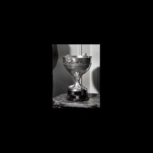 5 x 7 Kodak safety negative taken by Rosenfeld and Sons on November 19, 1935. View of Herb Mendelson and Clell Perry standing beside the President's Cup at the presentation ceremony. Both men are wearing suits. Mendelson was the owner of the hydroplane NOTRE DAME and Perry was his driver. Stamped negative sleeve: "73309F". Typed info.: "11/19/35 / Gold [crossed out] Cup Presentation / Mendelson & Perry with Cup". Note that both prints from this negative have Mendelson and Perry cropped out and focus directly on the trophy. CREDIT LINE: Mystic Seaport, Rosenfeld Collection.