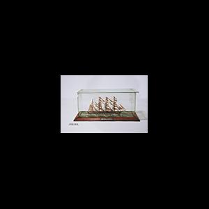 Full model of 4-masted bark ARCHIBALD RUSSELL. With sails, black hull with false gunports. Set in model water on wooden base. Glass case.