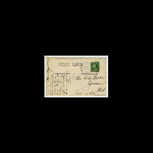 Real photo postcard, divided back; handwritten on back "EB 51911", and "TUG FAVORITE & ANN ARBOR NO. 4", and ". . . Here is another view of the car ferry. Notice the ore car being lifted out with crane, or derrick."; postmarked 1909; tugboat FAVORITE (built 1907) lifting ore car from capsized railroad ferry ANN ARBOR NO. 4 after loading mishap, Manistique, Michigan, Lake Michigan, 1909; see related postcards 2014.49.10428-10436.