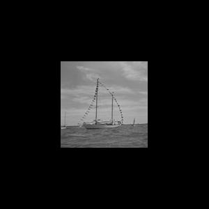 Safety negative; port view of ketch yacht CARIB dressed up at anchor; flying New York Yacht Club burgees; New York Yacht Club regatta; handwritten on original contact card "CARIB at Nantucket Island, Mass. Aug 1946. 'Dress Ship' on occasion at New York Yacht Club's Annual Cruise. (Note NYYC flag flying over all from mainmast; owner's burgee from mizzen' U.S. Yacht Ensign on staff at stern.)"; for similar views see '1996.31.662-.667' and '1996.31.669'; handwritten on original envelope "774". Photographed by Carleton Mitchell.