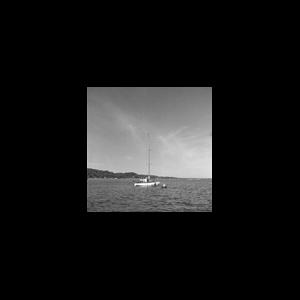 Safety negative by Carleton Mitchell; unidentified sloop at anchor in possibly Chesapeake Bay; several dinghies being rowed alongside her; for handwritten on original envelope neg.no. '2605', corresponds to original Mitchell contact;