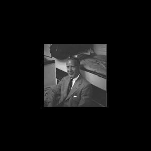 Safety negative by Carleton Mitchell; view of the interior of yawl yacht ARGYLL, with an unidentified man sitting on the floor with his back to an unoccupied bunk; possibly in Glen Cove, New York, for the start of the Glen Cove to Port Jefferson Race 1948; for other views of this race see 1996.31.2526-2573; for similar interior views, see 1996.31.2529-2532; handwritten on original envelope neg.no. '2612', corresponds to original Mitchell contact;