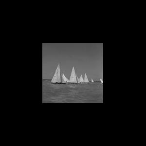 Safety negative by Carleton Mitchell, photographed March 27 - April 2, 1949; starboard view of several Star class sloops engaged in a close tacking race during the 1949 Spring Championship Series, Nassau, Bahamas; at left, WAHINI (2459), then GEM II (1976), both in middleground front; behind, at left, CARIBEE (1500), then FAIRWIND (1902); SHADOW (1549) visible behind FAIRWIND, with several other sloops unidentified in background; for other views from this race, see 1996.31.3229-3256; handwritten on original envelope neg.no. '3354', corresponds to original Mitchell contact; REF: 'Log of the Star Class' (1950) pg. 68.