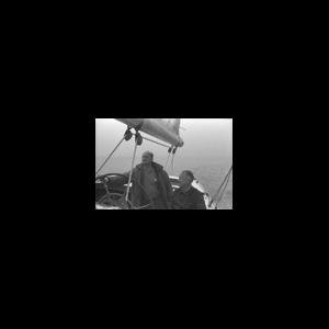 35 mm black-and-white negative; Carleton Mitchell and captain Peter Scott at the helm of America's Cup 1964 challenger 12 meter SOVEREIGN; underway; probably practicing prior to the race; 1964; handwritten on original envelope "CS 480" and "C-1" (corresponds to original Mitchell contact sheet); handwritten on back of original corresponding contact sheet "C. MITCHELL/ CS - 480/ 9-25-64"; printed on negative frame number "28".