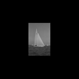 35 mm black-and-white negative; photographed by Carleton Mitchell; 12 meter AMERICAN EAGLE under sail; motor yachts also in view; during the America's Cup trials; 1964; handwritten on original envelope "CS-480" and "C-8" (corresponds to original Mitchell contact sheet); handwritten on back of original corresponding contact sheet "C. MITCHELL/ CS-480/ 9-25-64"; printed on negative frame number "3A".