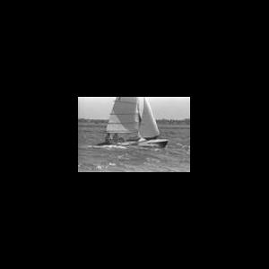 35 mm black-and-white negative; photographed by Carleton Mitchell; catamaran TIGERCAT under sail; Eric Olsen at the tiller with Glen Foster next to him; during the One-of-a-Kind Regatta; February 21 - 23, 1959 at the Coral Reef Yacht Club, Miami, Florida; handwritten on original envelope "R 26371-C2" (corresponds to original Mitchell contact sheet); printed on negative frame number "9". Ref: "Yachting Magazine", April 1959.